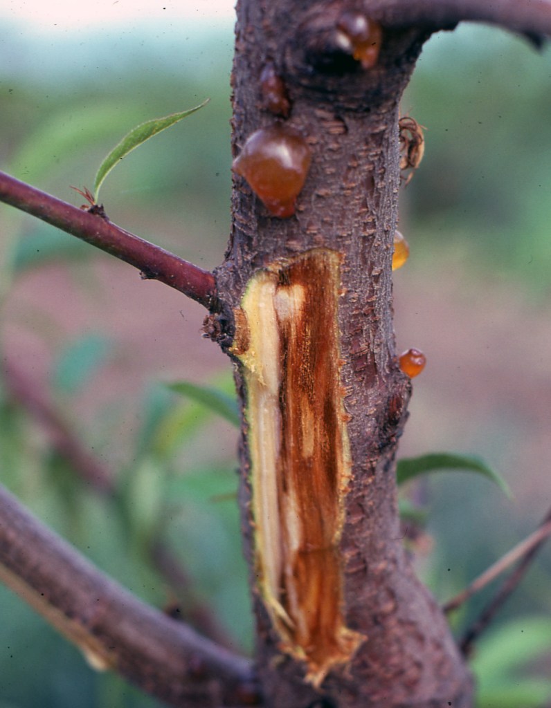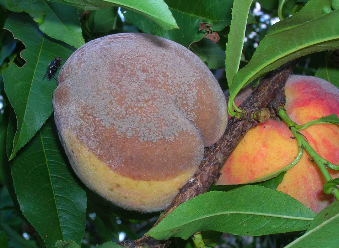 Last, there is the ever-present issue of Brown Rot. This disease is caused by four species of Monilinia with the predominant species being M. fructicola and M. laxa. Brown rot fungus has the ability to attack blossoms, fruit, spurs (flower- and fruit-bearing twigs), and small branches under favorable conditions in the spring. Disease severity is dependent upon environmental conditions. Blossom blight can be expected in humid, rainy weather with mild daytime temperatures (68°F–77°F; 20°C–25°C) and cool nights. Mature fruit rot occurs at high temperatures in conjunction with high humidity. Under the right conditions, the entire tree’s crop can be completely rotted.