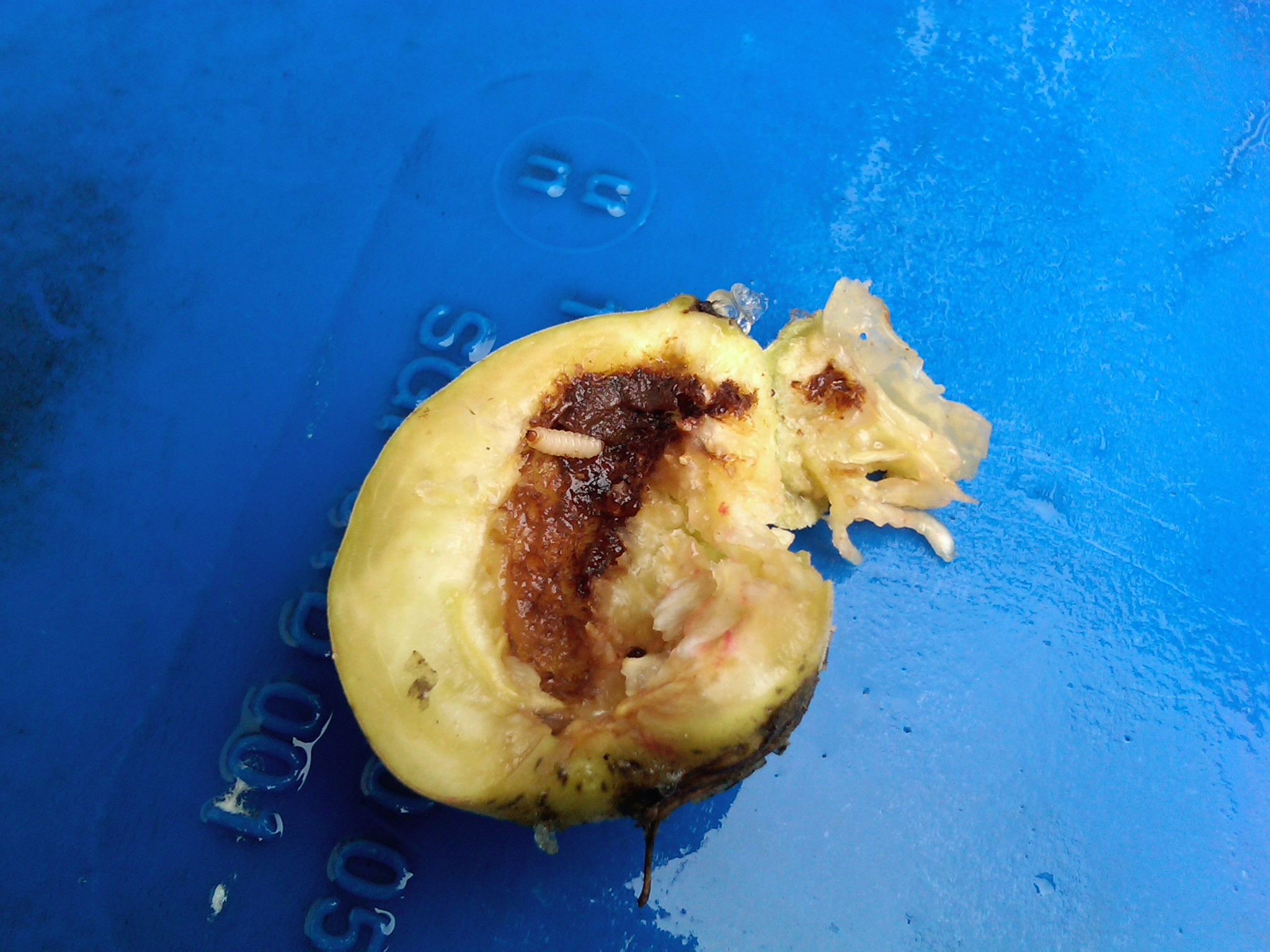 To control this insect spray must be made from shuck split (about the time the fruit is formed) and for two applications at two-week intervals and then 30 days before fruit harvest. This last spray is probably the most important since the eggs laid hatch out and the larva are still in the fruit at harvest. Recommended organic sprays include BoteGHA, Mycotrol or Botanigard MAXX all with Beauveria bassiana bacteria, Grandevo with Chromobacterum subtsugae, Venerate with the Burkholderia spp., Surround which is a kaolin clay product, and Pyganic. There is no insecticide to treat the soil with but keeping old fruit off the ground helps prevent next year’s problems. It might be interesting to see if a biological on the soil would help take out the overwintering adults, and if you do and it works let me know.