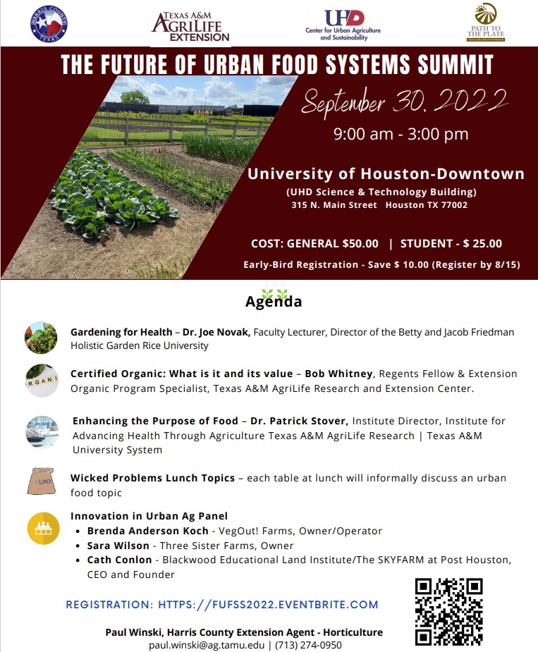 Last Friday, September 30, I had an opportunity to speak at the Future of Urban Food Systems Summit held at the University of Houston Downtown campus. This was not my usual audience and really not my normal program topic, but it was really interesting, engaging and informative. What a wonderful group of people and many if not most, were young – much younger than me!