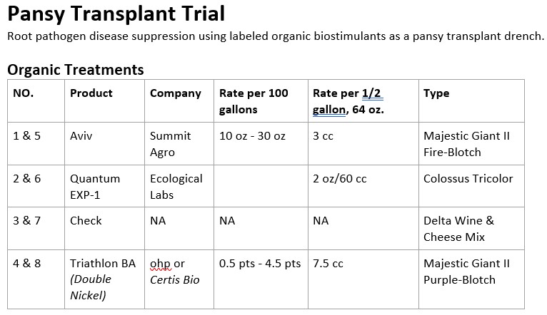 This small research/demonstration idea came from a local independent nursery operation, Country Flower Plant Farm, that is one of my favorites. Last year they had a terrible problem with pansy plugs dying either shortly after transplanting into trays or even later as they were sold and planted into customer beds. I suggested last year that they consider some organic soil drench treatments to stop the disease. They were quick to say that they don’t use chemicals and wouldn’t even know how to use them, this is exactly what I wanted to hear!
