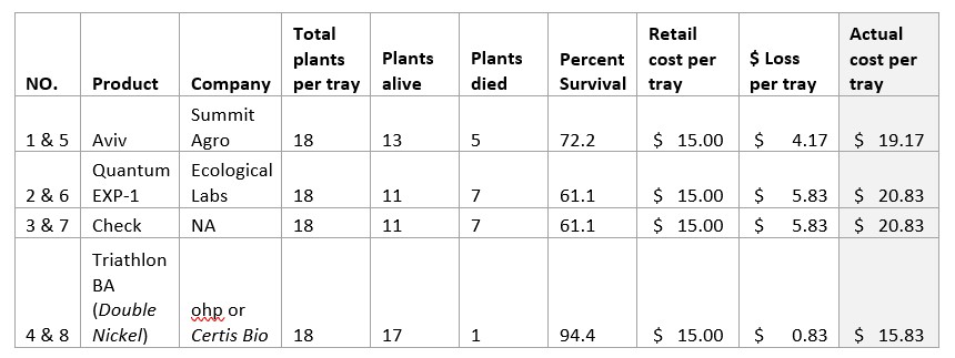 Here are the final results of plants that lived and died, and the cost associated with the losses. Unfortunately, I don’t know if the actual reason for plant loss was from specific root diseases or that the organic treatments were the result of more or less plant survivability or loss. That said, the fact that the untreated check had the highest death loss (equal to treatment 2/6) is an indicator that the treatments had an effect.