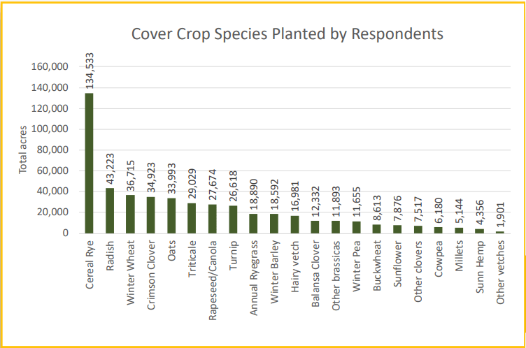 Okay, there is a lot more information in the report, but I want to mention this because it is a question I get a lot – what cover crop to plant? First let’s take a look at the acres planted to each species so you get an idea of the importance farmers placed on the species.