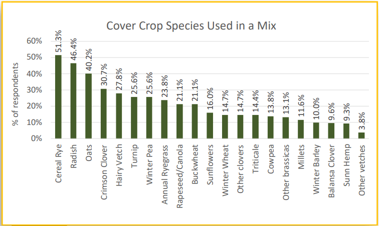 You can tell that cereal rye is by far the most popular either by itself or in a mix. I was surprised by the acres dedicated to radishes but I do know they are popular in the Midwest. I really thought that cowpeas, sunn hemp and other summer cover crops would be planted on more acres but probably only in southern states and as I mentioned not many farmers in southern states participated in the survey.
