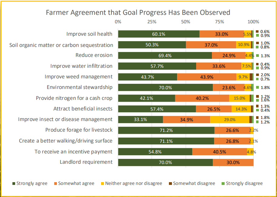 I am going to skip over a lot of demographic information in the survey to get to some data on cover crops. I love this chart above because it gives us a reason for planting cover crops, in other words, “why are you planting a cover crop and does it do what you want?”