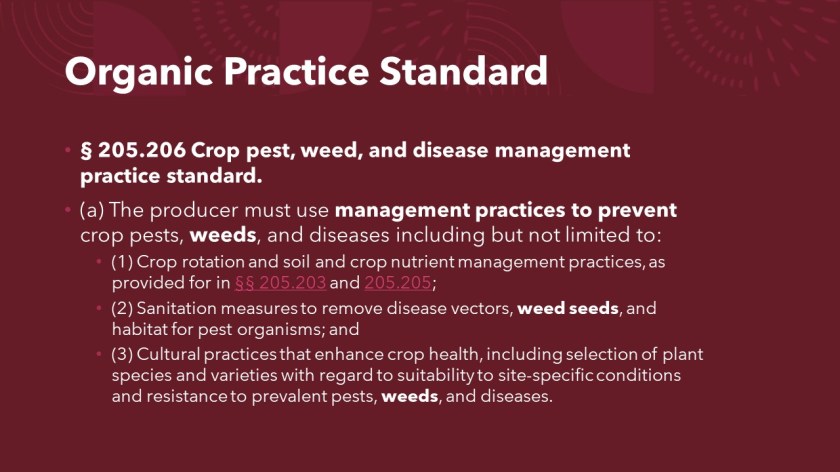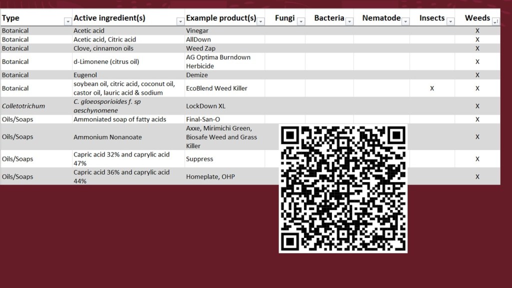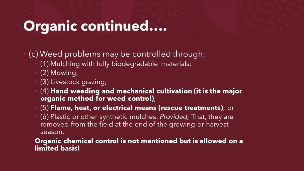 Organic does have “chemicals” approved for weed control and in this slide, you see that there are not many. The QR code takes you to the whole list. or just click here: Organic Products List