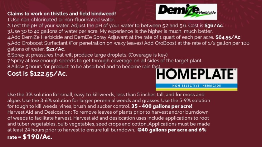 This slide illustrates the reason that organic “chemicals” are used sparingly. The cost per acre makes them expensive but they work great for spot treatments around the farm.
