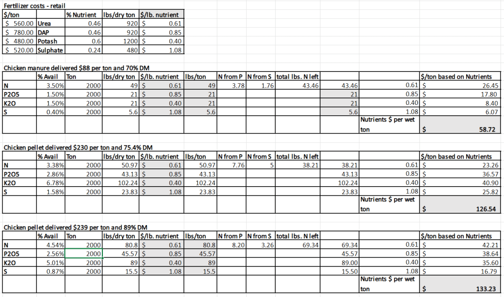 I did this analysis above on three different companies selling different products. One was a manure product that had been composted to remove some water but not all, and the other two were pelleted compost products which is very common now. To do the calculations I first have to get to a 100% dry matter (DM) basis, so I multiply the ton or 2,000 lbs. times the %DM. In the first example there is 3.5% nitrogen X 1,400 lbs. of DM = 49 lbs. of nitrogen. Nitrogen is also in a phosphorus source (18-46-0) and in the sulphur source (21-0-0-24) so I have to subtract that out to get a value for the nitrogen in the chicken manure based on nutrients I can buy from commercial fertilizer. I do this for all the manure nutrients to establish a value for nutrients.