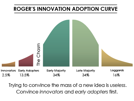 I couldn’t begin to tell you much about Rogers or his overall work as an educator, but I do know about this curve and in my career this “curve” has proven to be true over and over again. What you see in this picture is the classic “bell curve” representing the concept of knowledge or technology. People who adopt new knowledge or technologies are represented along the bottom axis and the progression is from left to right, i.e. the first to adopt are on the left and over time the others adopt the technology. So, looking at this we see that the first group to adopt the technology are innovators followed by early adopters and so on. This picture shows a break called “The Chasm” between early adopters and early majority. This chasm is difficult to cross and can represent a lot of time or even failure for the technology.
