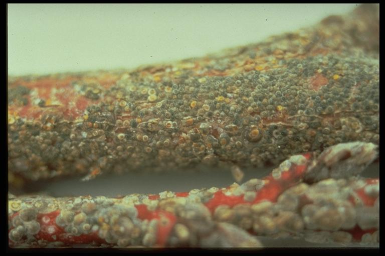 San Jose Bark Scale is one of the major insect pests of peaches and maybe one that causes the most damage. The first signs of infestation include a decline of tree vigor, leaf drop and appearance of sparse yellow foliage, particularly on the terminal growth. Reddish spots on the underside of bark and around scales on leaves or fruit result from feeding of immature stages. In severe cases, the entire surface of bark can become covered with layers of overlapping grayish scales. Cracking and bleeding of limbs occur, and heavily injured trees may die.