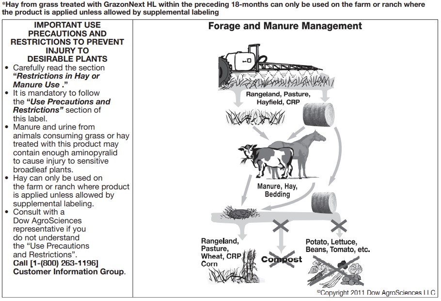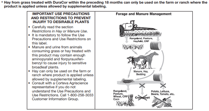 Grazon Next and Duracor have on their label (below) that it is only to be used on forage intended to be used on the farm and manure is not to be composted and used on vegetables. When a producer buys Grazon Next or Duracor, they are required to be warned about this restriction. I really do believe that most producers who use the product know the danger, whether they abide by it or not.