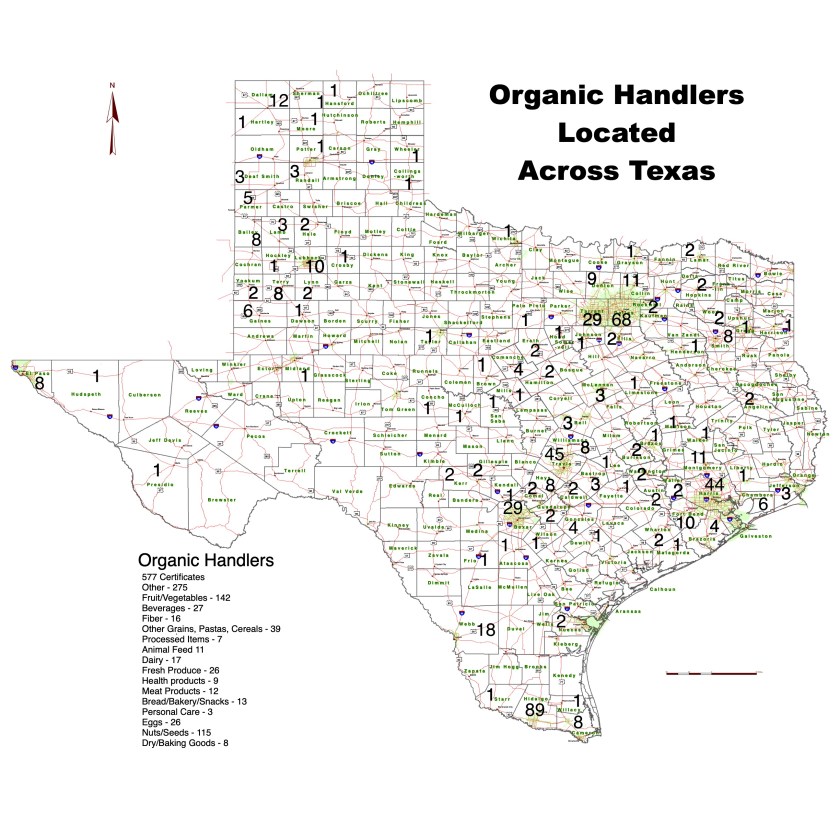 The maps below are an attempt to help you see and know what and where organic in Texas is located. There is a lot going on in this well over $1 Billion dollar a year industry! You can click on the individual maps to see a larger picture.