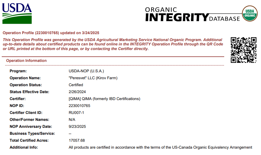 This is the Kirov Farm called Peresvet. You are looking at a portion of their organic certificate that I downloaded from the Organic Integrity Database (OID). But there is more: