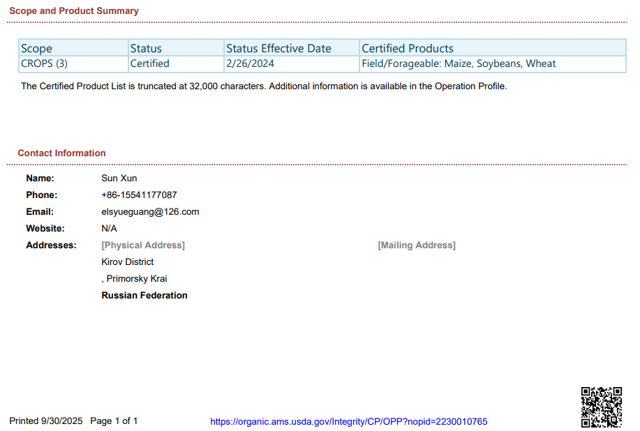 The listing you shared is for an organic operation certified in the Russian Federation, specifically in Primorsky Krai within the Kirov District.