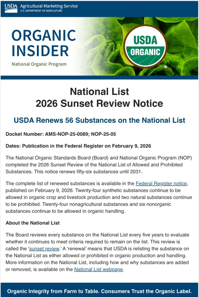 Periodically USDA NOP approved inputs are reviewed and either allowed or prohibited to continue to be used in certified organic system plans. This Sunset Review process involves the NOSB and National Organic Program.