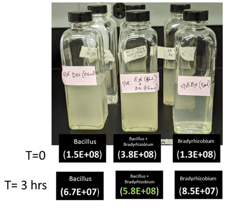 Using this feature, cell counts were made for the Bacillus (blue) and Bradyrhizobium (orange) at 0 hours and again at 24 hours after being in a mixture (Figure 3). You can see that cell counts were not reduced substantially from 0 to 24 hours for either product.