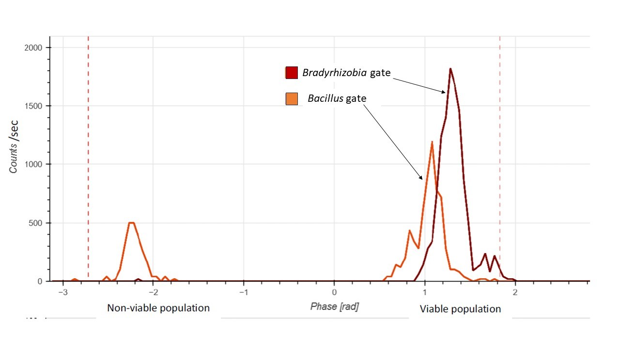 Figure 2. Flow cytometry discerns Bacillus and Bradyrhizobium individually and in mixtures with two peaks of different amplitudes on the y-axis and in different phases on the x-axis.