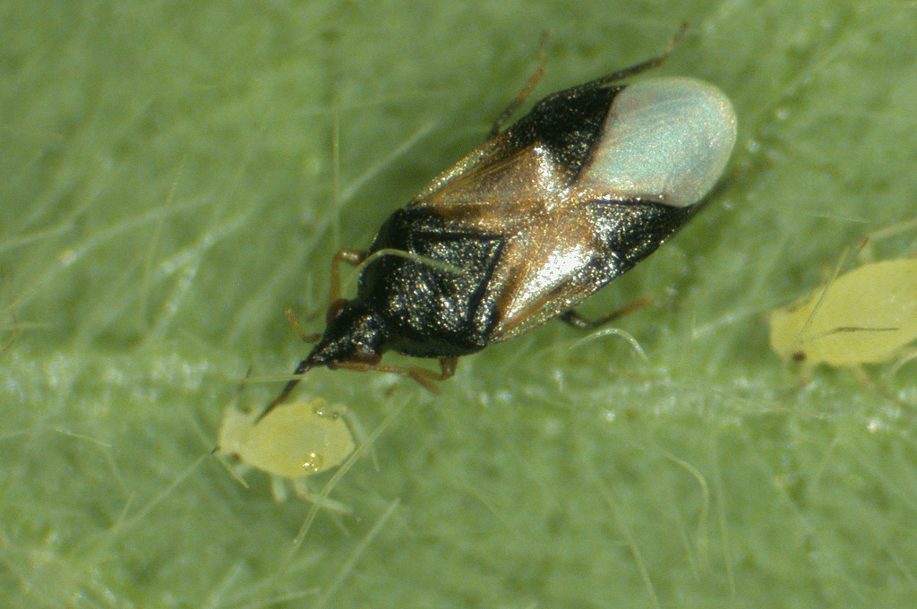 Orius majusculus Targets: Thrips: Both adult and larval stages, Aphids, Mites, Whiteflies, Psyllids, Caterpillars