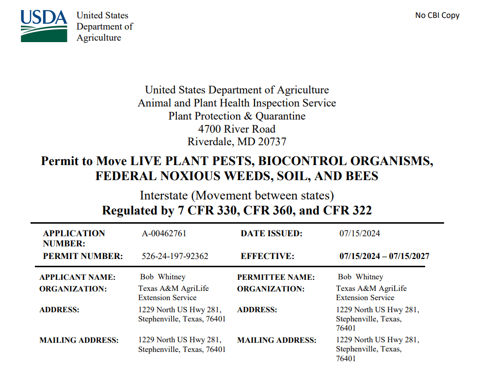 Most of the information pointed me to the State of Colorado and Nina Louden Biocontrol Specialist with the Colorado Department of Agriculture. The first thing Nina asked me, “Do you have a USDA permit to allow us to ship “biological control agents” across state lines?” At that time, I didn’t even know there was a need for a permit, but I soon found out you can apply for one online. There was much in the application process I didn’t understand but overall, it was simple and easy. I got my “permit” as you can see below