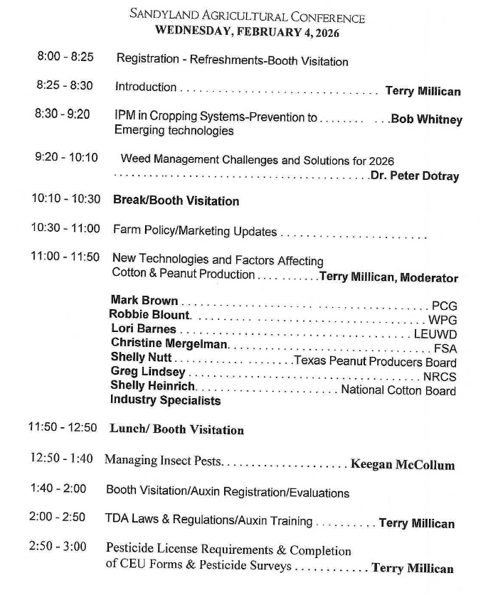 Wednesday, February 4 – Sandyland Crops Conference, Seminole, Texas. 8am to 3 pm. Lots of speakers and plenty of exhibitors. For more information call Amanda at the Gaines Co. Extension Office – (432) 758-4006 Click here for a tentative program